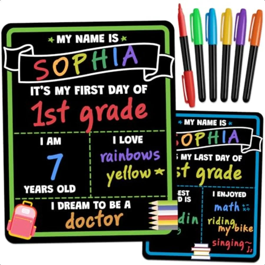 First Day of School Sign Board with Liquid Chalk Markers - 14”x11” Double-Sided & Reusable