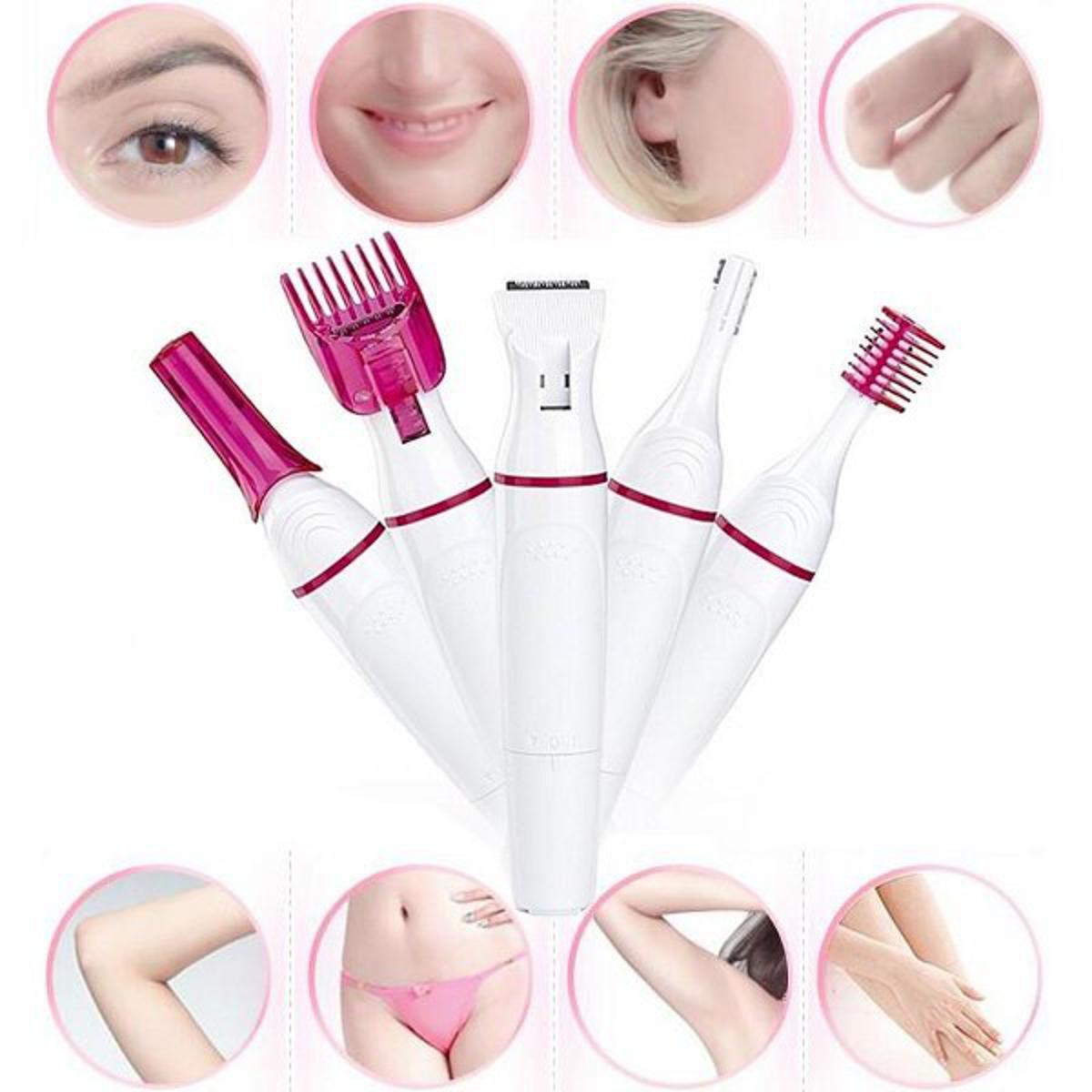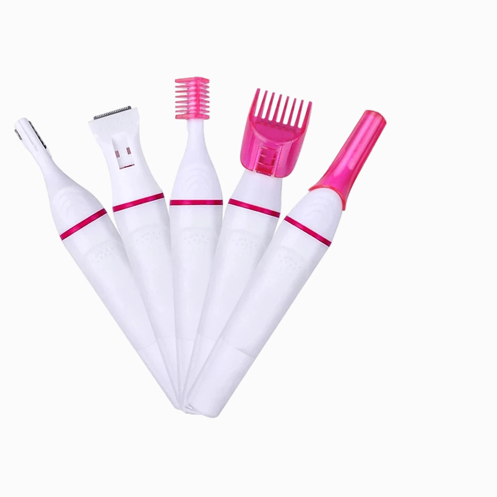Includes eyebrow trimmer, facial shaver, nose trimmer, body hair shaver, and bikini line head — providing complete grooming care in one portable device.