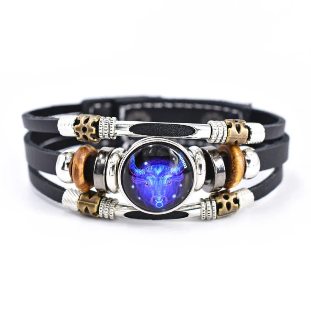 Luminous Constellation Leather Bracelet | Retro Multi-Layer Zodiac Bracelet for Men Women Couples | 12 Signs Adjustable Gift Jewelry