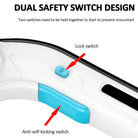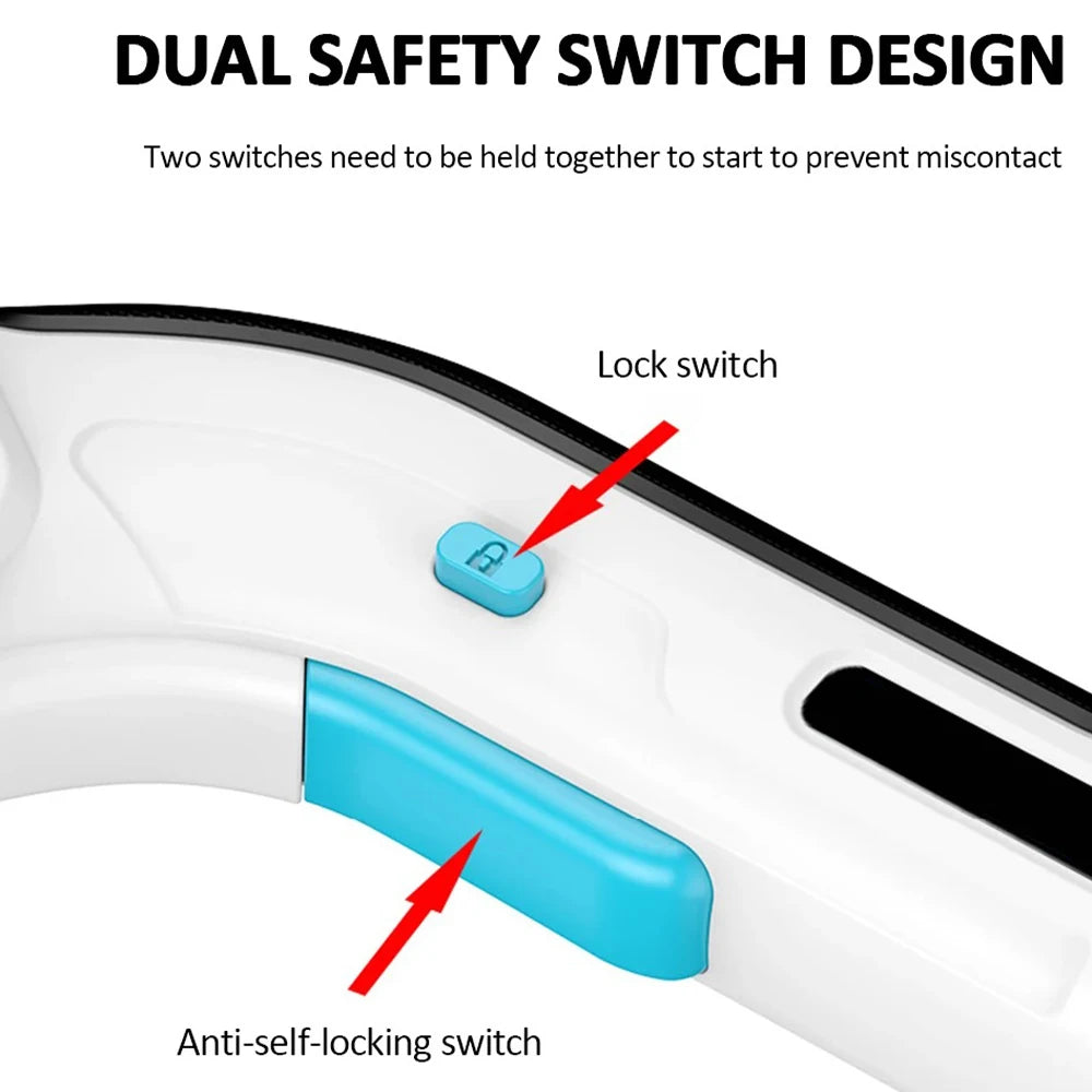 To prevent accidental start-ups, the tool requires pressing a top safety button and the handle trigger simultaneously. Stops automatically upon release.