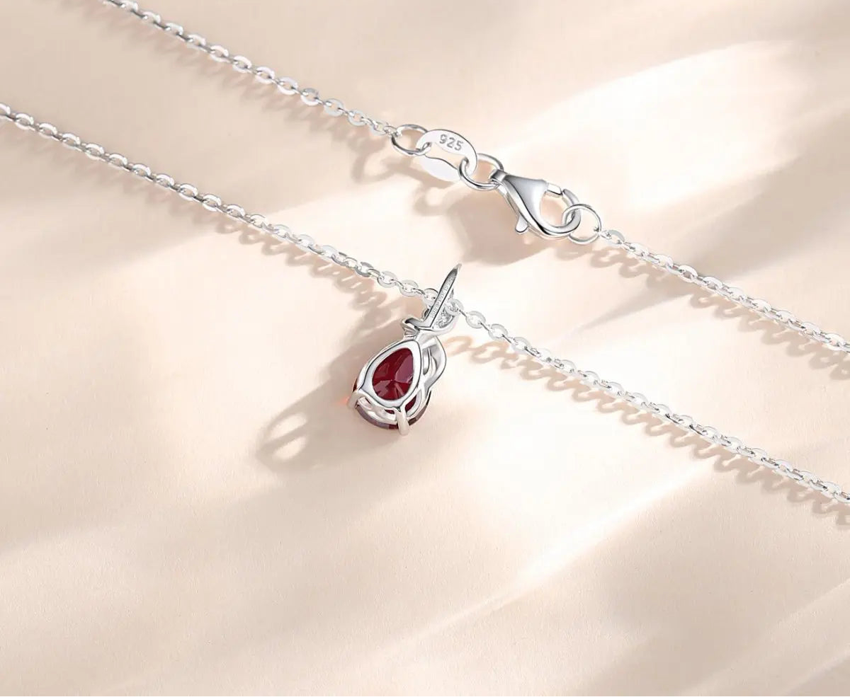 This July birthstone necklace features a pear-shaped artificial ruby that embodies passion, kindness, and dignity. Inlaid with a 0.04 carat diamond, the pendant delivers a radiant sparkle that captures the light with every movement, making it perfect for any special occasion.