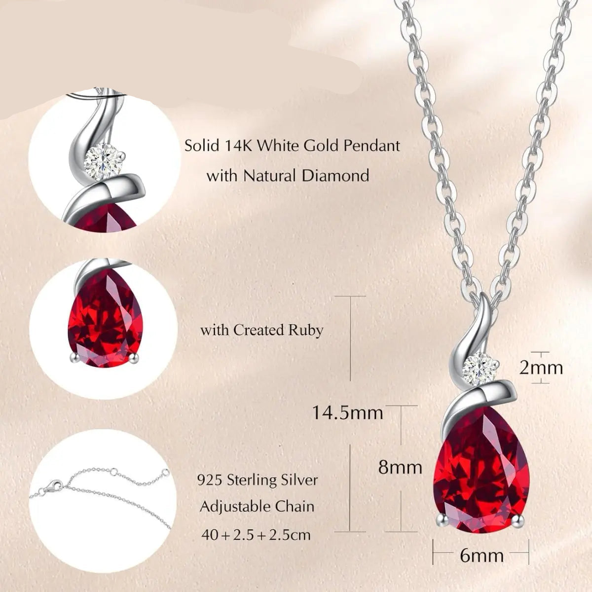 14K Birthstone Pendant Necklace for Women – Ruby Teardrop Pendant with Diamond Accent