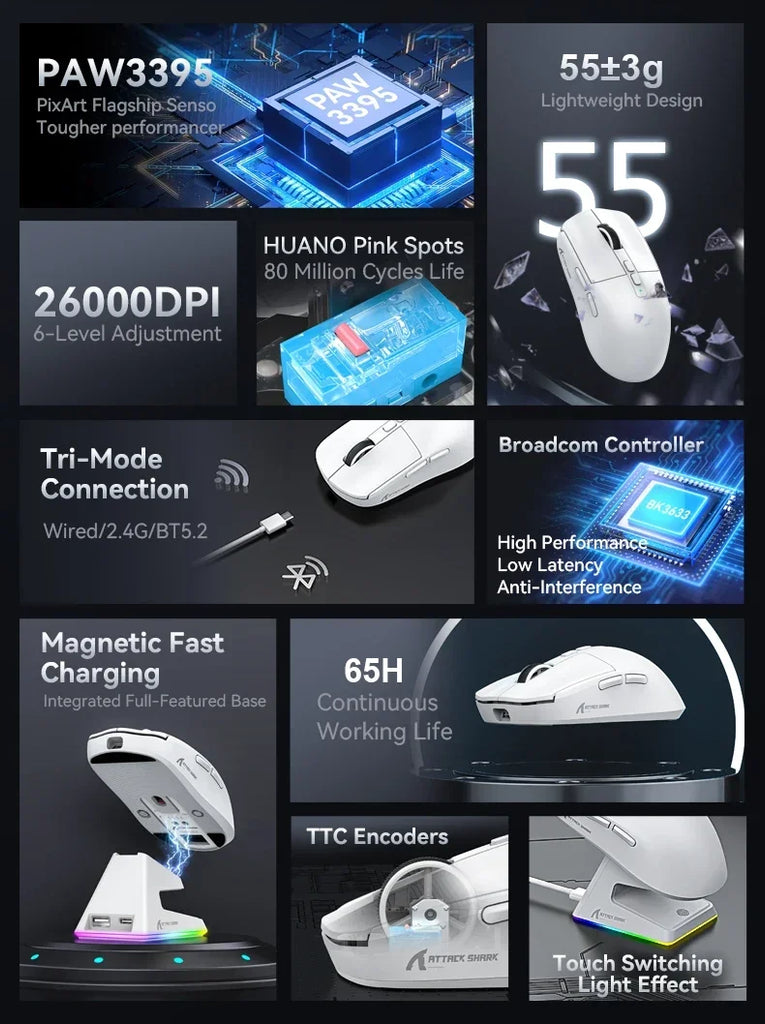 Featuring the PixArt PAW3395 sensor, 26,000 DPI, tri-mode connectivity, and a magnetic RGB charging base, the X6 redefines elite gaming performance in a lightweight 55g shell.