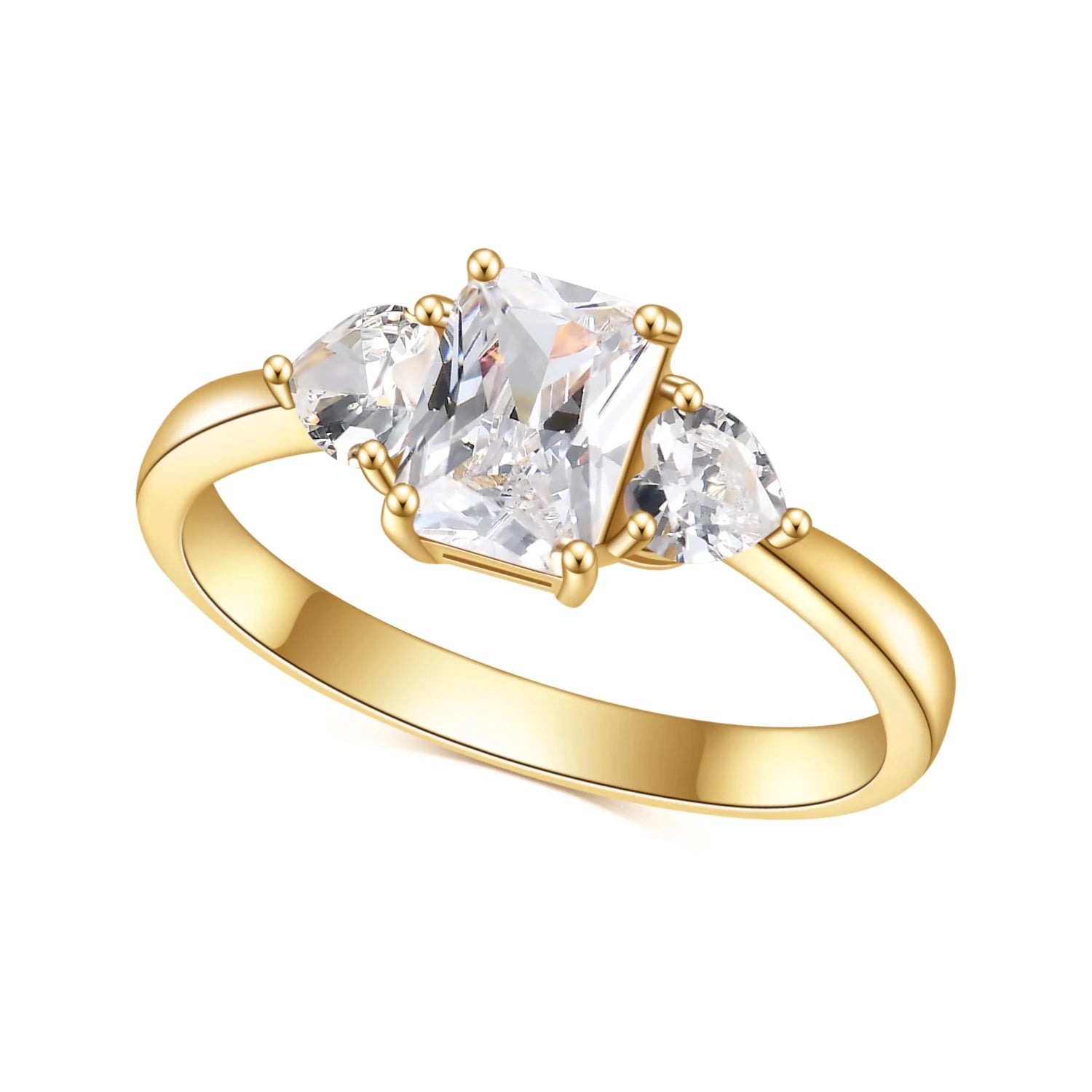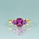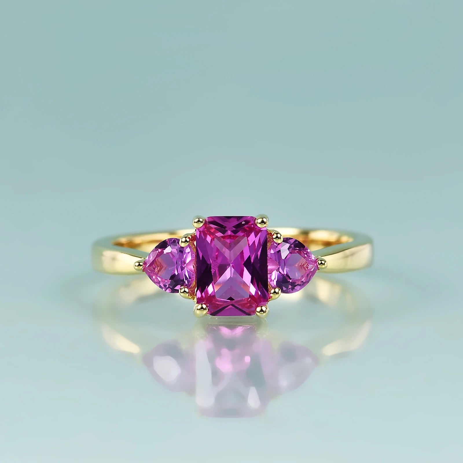Celebrate love and elegance with this stunning Three-Stone Engagement Ring, featuring a dazzling lab-created pink sapphire center stone flanked by two radiant side stones. Crafted in solid 925 sterling silver and plated in luxurious yellow gold, this romantic ring blends timeless charm with modern sparkle, making it perfect for engagements, anniversaries, or statement fashion wear.