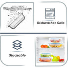 Crafted from high-quality borosilicate glass, these containers are oven, freezer, microwave, and dishwasher safe. Please remove lids when using in the oven, microwave, or dishwasher.