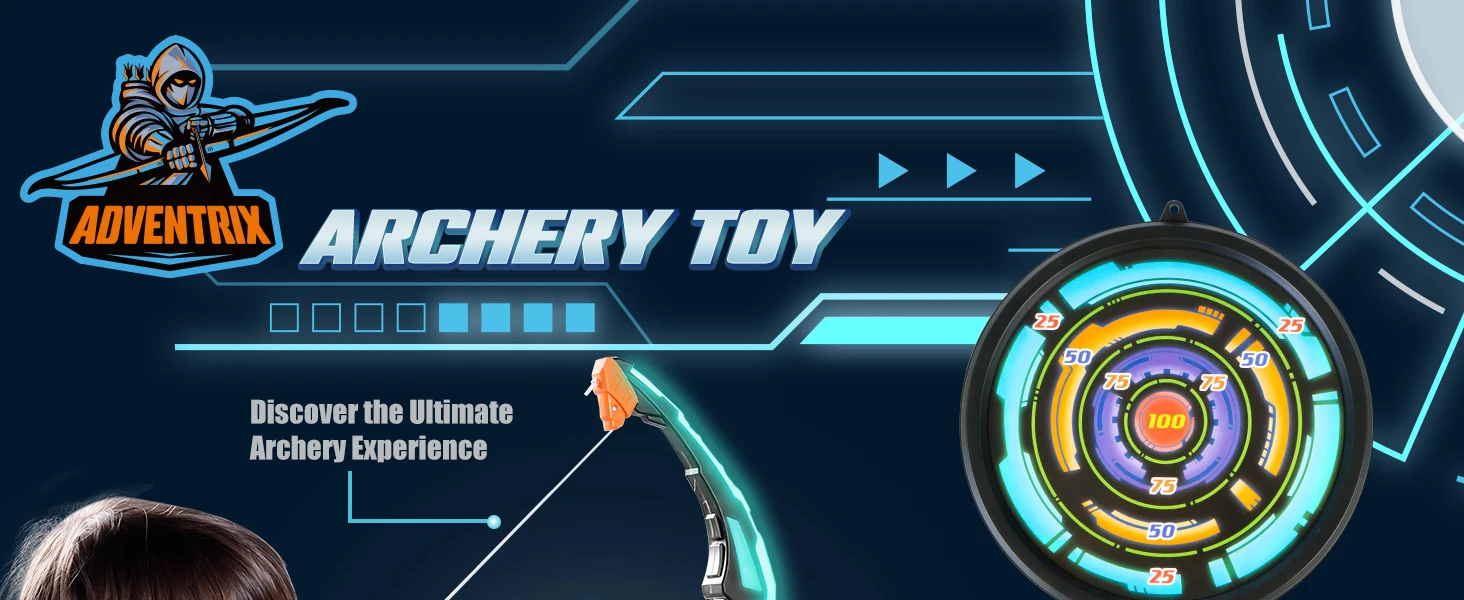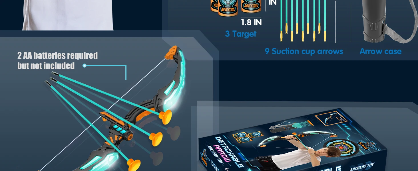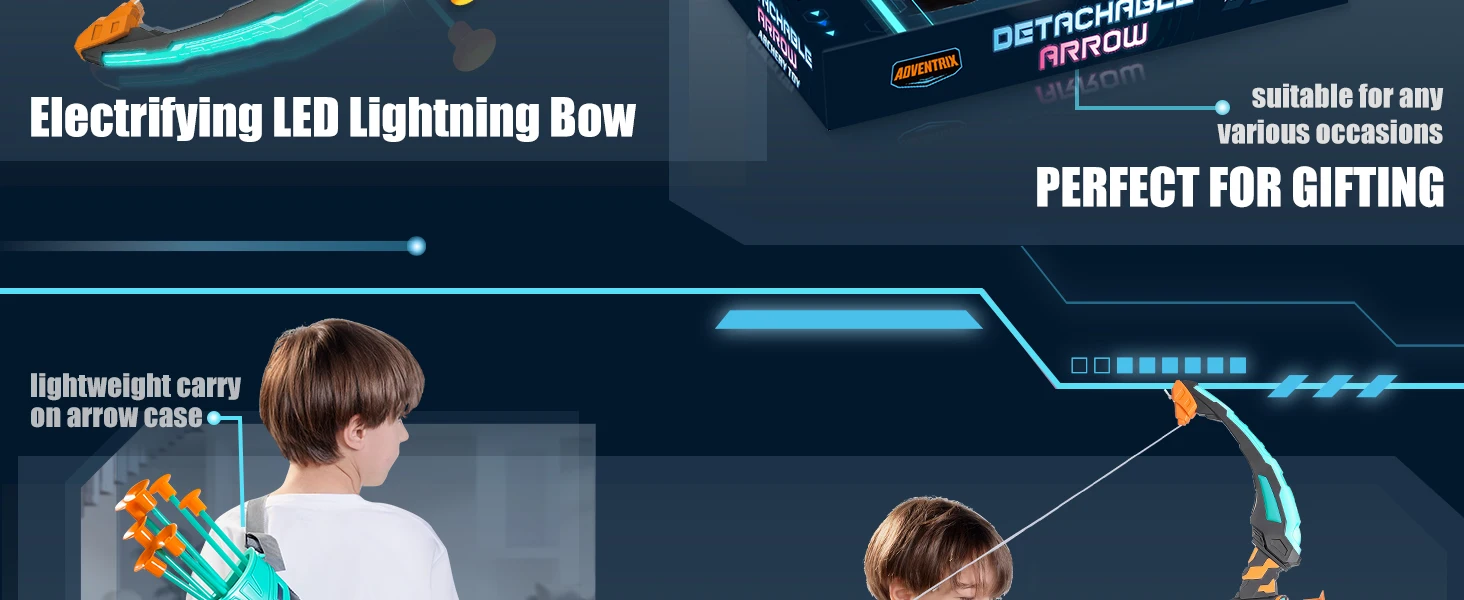 Give children an exciting and safe introduction to archery with this LED Bow and Arrow Set. Designed for ages 6–12, this complete archery toy helps develop hand-eye coordination, focus, motor skills, and outdoor play activity. With durable construction, light-up features, and 9 suction cup arrows, this set provides hours of engaging and screen-free entertainment.