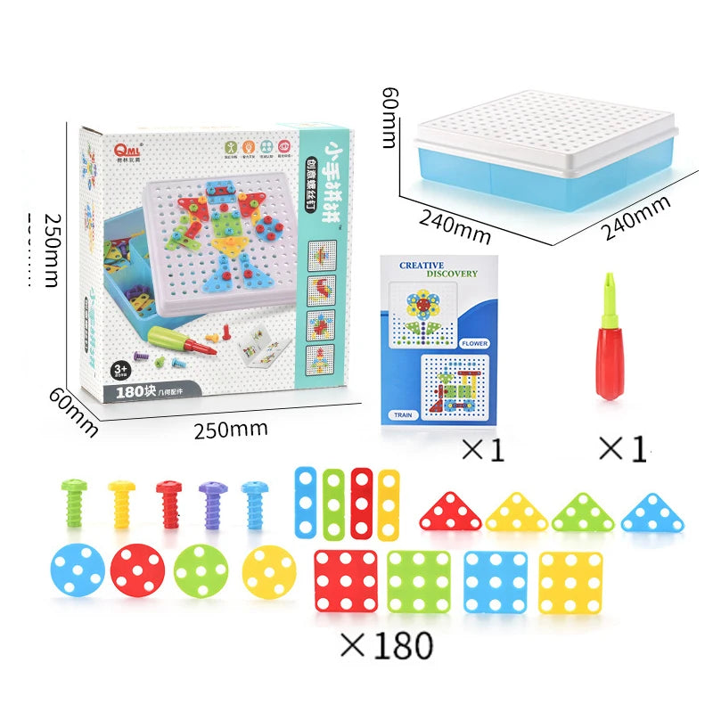 Inspire creativity, imagination, and hands-on learning with the Kids Screw Nut Mosaic Puzzle Toy — a fun, colorful, and educational 3D building game designed to enhance fine motor skills and early cognitive development.