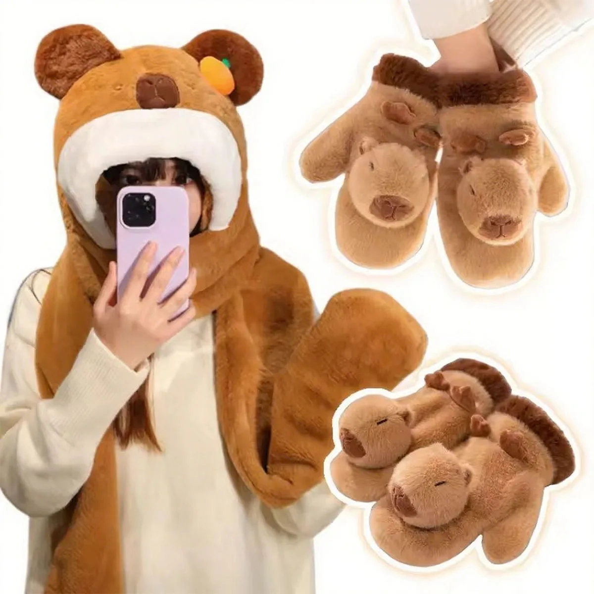 Add warmth and cuteness to your winter days with the Cute Capybara & Penguin Plush Gloves with Hat and Scarf Set — the perfect blend of comfort, charm, and practicality. Designed from ultra-soft plush fabric with PP cotton filling, these gloves provide a cozy, skin-friendly feel that keeps your hands and head warm during the chilly months.