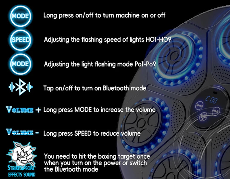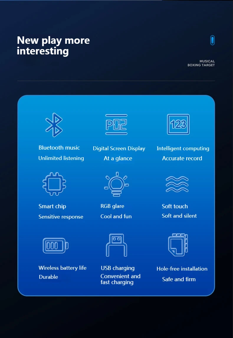 Upgrade your fitness experience with the Smart Bluetooth Music Boxing Trainer, a wall-mounted electronic boxing target designed for interactive training, cardio workouts, and stress relief. Whether you're a beginner or a seasoned athlete, this high-tech punching pad combines music, intelligent feedback, and multiple training modes to help you improve coordination, reaction speed, and endurance at home or in the gym.