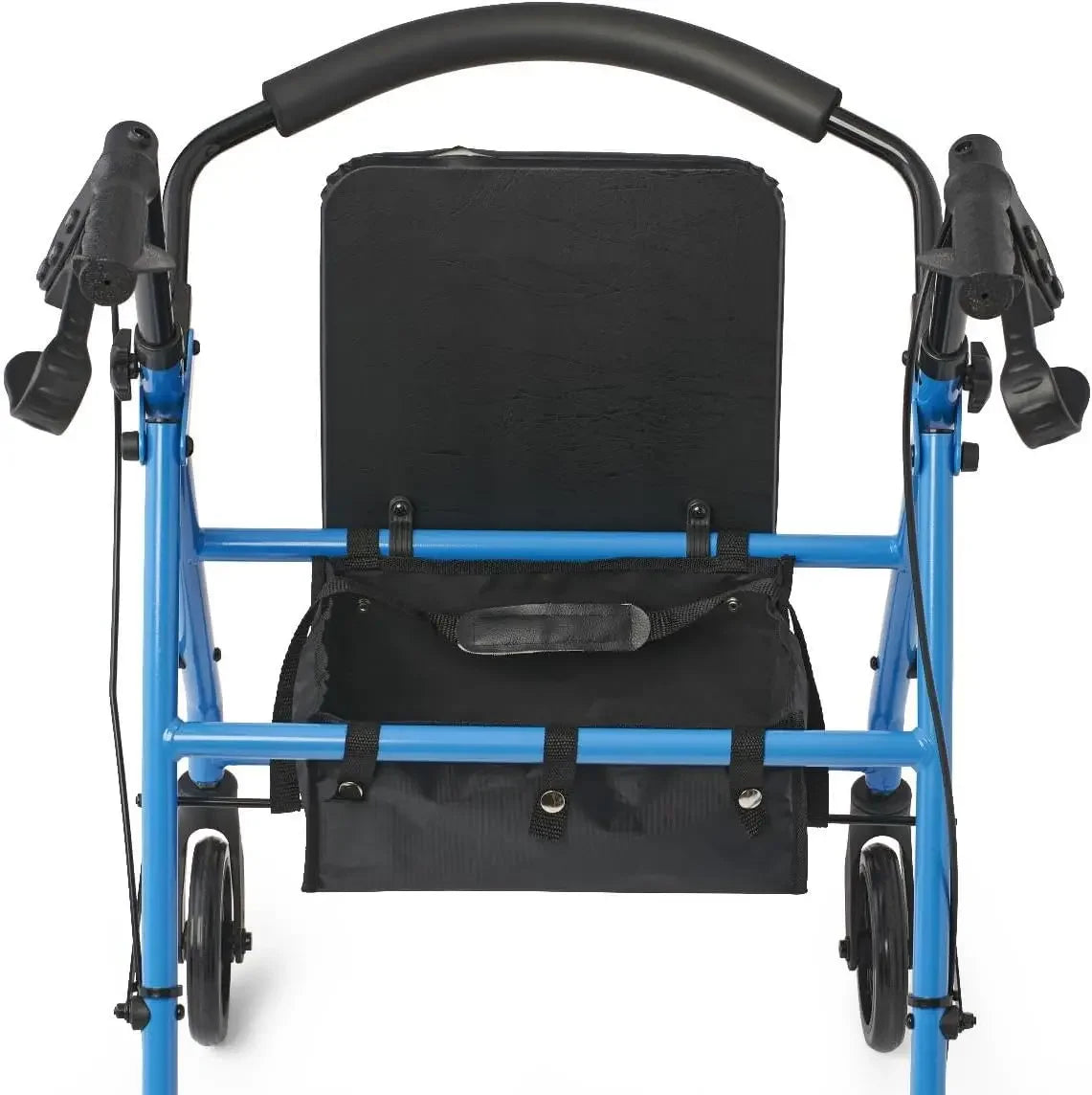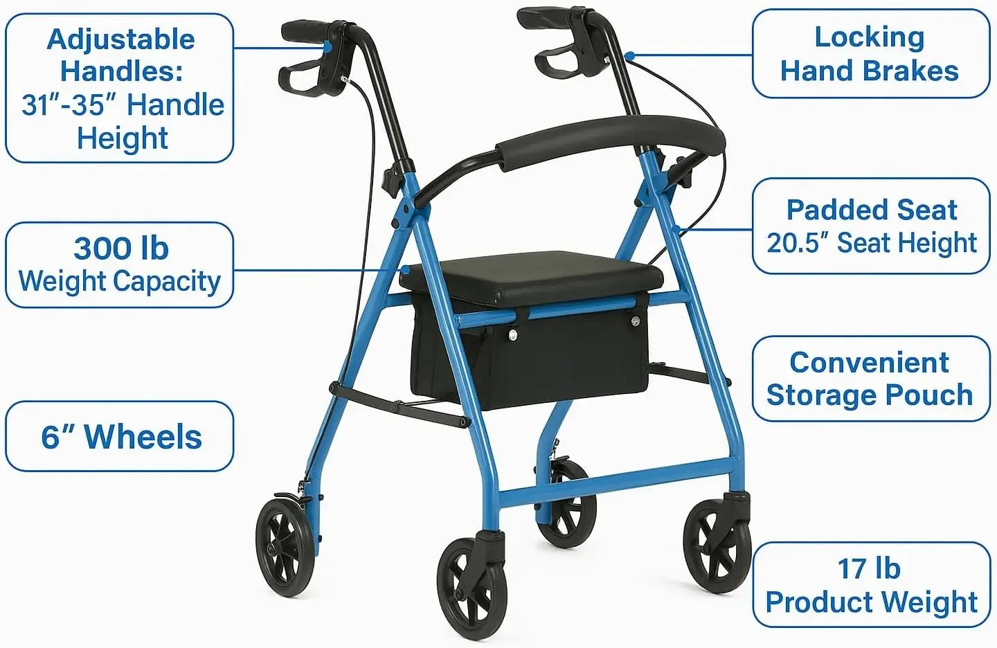Equipped with 6” non-marking wheels, adjustable ergonomic handles (31"–35"), and locking hand brakes, this walker ensures smooth mobility and safe stops indoors or outdoors. The built-in padded seat with backrest provides a stable and comfortable spot to rest when needed, while the foldable design allows for compact storage and easy travel.