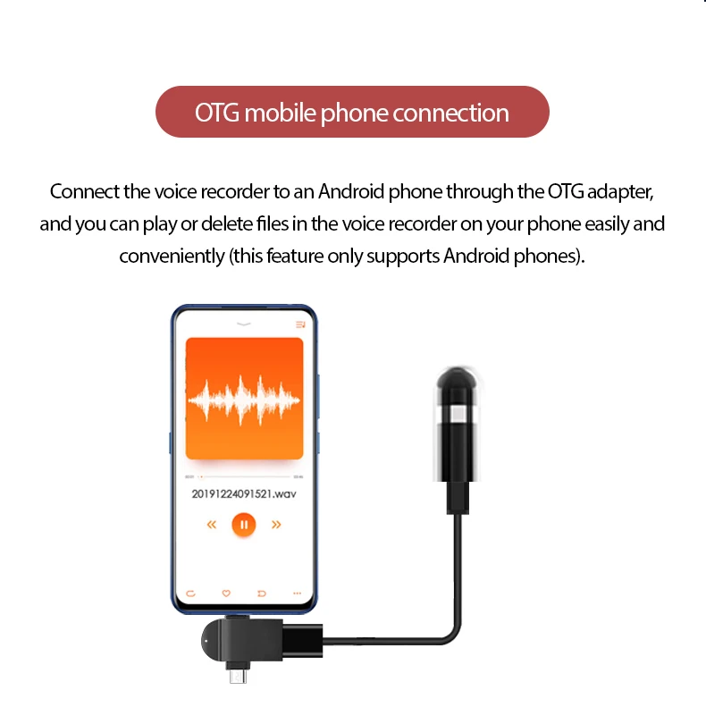 Connect the voice recorder to an Android phone through the OTG adapter, and you can play or delete files in the voice recorder on your phone easily and conveniently (this feature only supports Android phones).