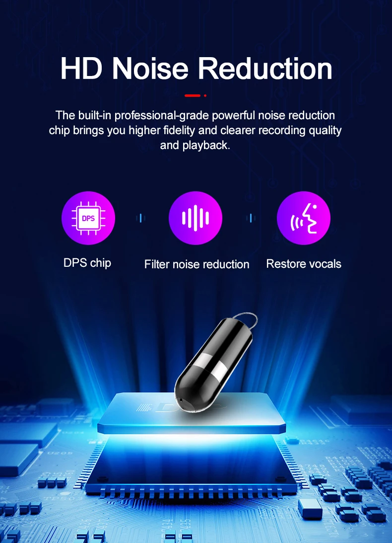 The built-in professional-grade powerful noise reduction chip brings you higher fidelity and clearer recording quality and playback.