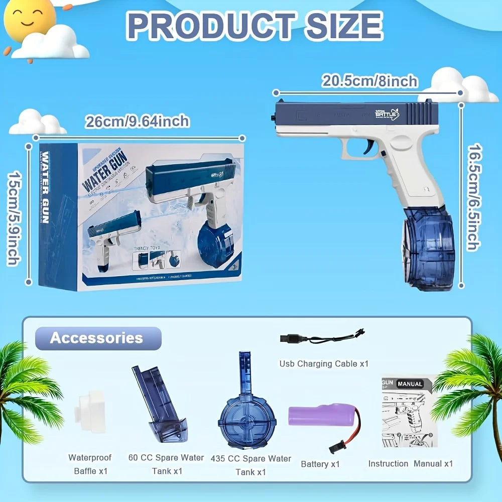 Whether you're heading to the beach, planning a pool party, or just cooling off in the backyard, this electric water gun brings excitement to any setting. It’s a must-have for summer activities, family outings, and birthday parties. -