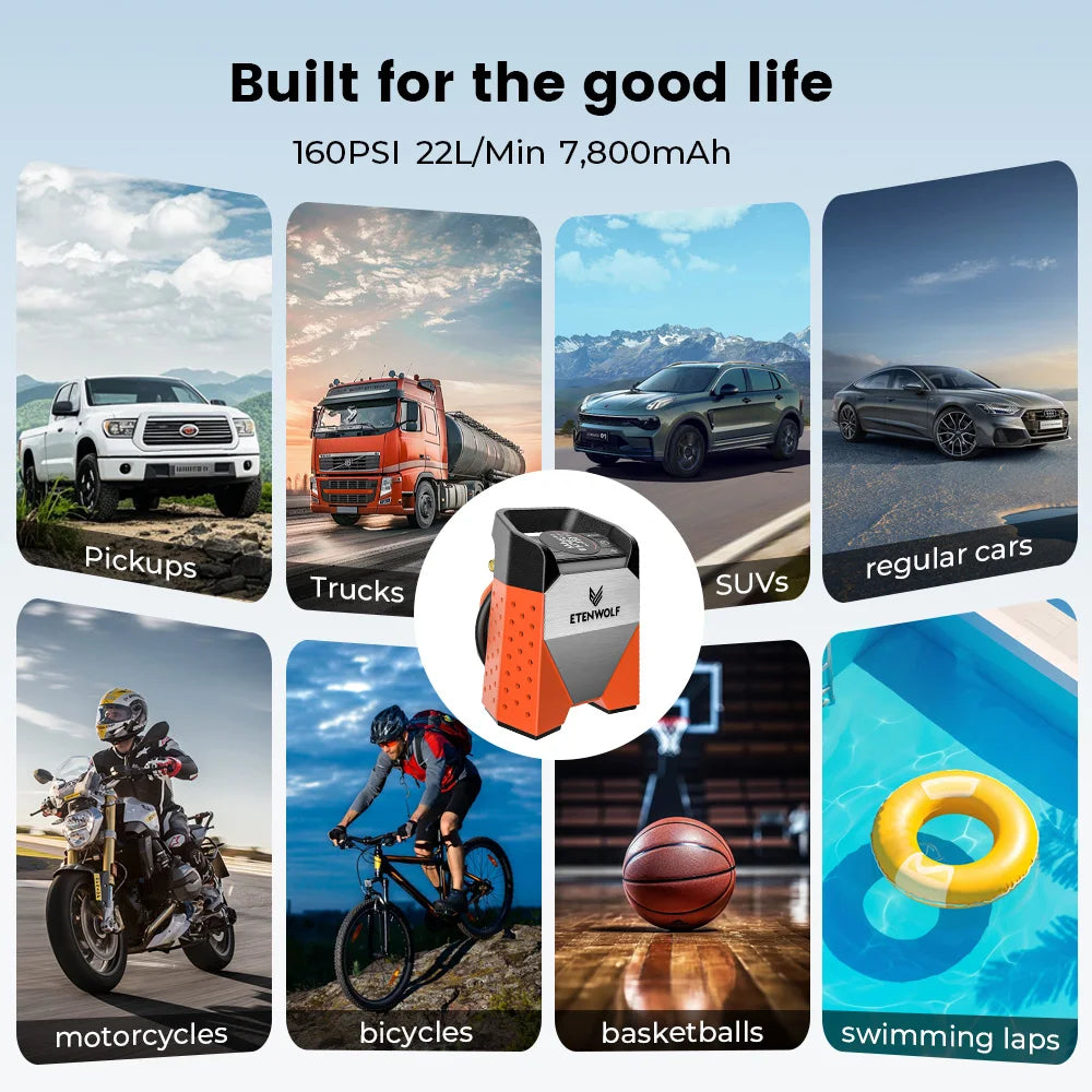 With 160 PSI high pressure, a 100% duty cycle, and a massive 7800mAh rechargeable battery, it delivers continuous inflation, emergency power, and illumination — all in one rugged, travel-ready device.