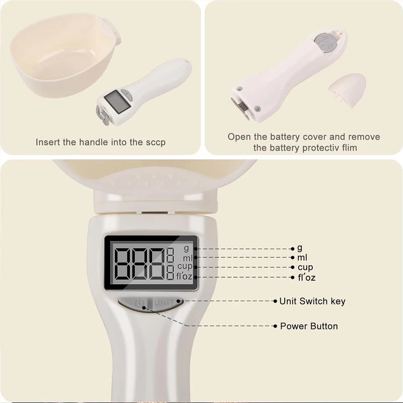 Designed with convenience and functionality in mind, it features a detachable scoop head for easy cleaning, an ergonomic handle for comfortable use, and a clear LED display. Quickly switch between grams, milliliters, cups, and ounces with a simple button press, making it perfect for both dry and wet foods.