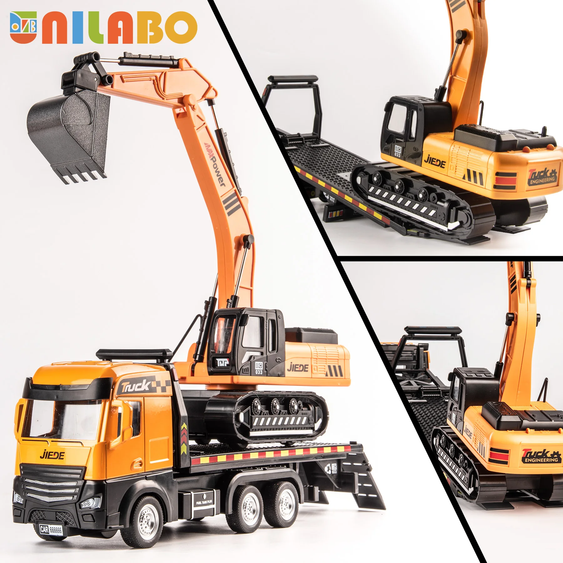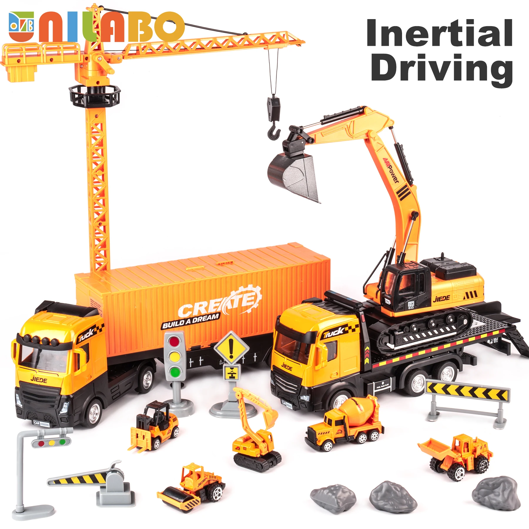 Includes multiple diecast construction trucks such as a container truck, excavator, tower crane, and road signs. Each vehicle features detailed craftsmanship, movable parts, and smooth rolling wheels for an authentic play experience.